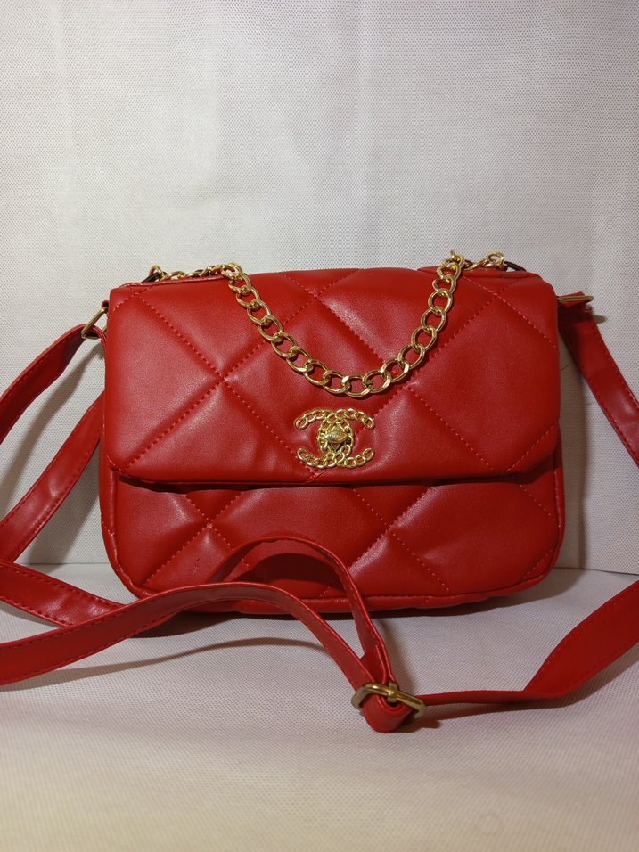 Kırmızı deri, zincir detaylı kadın çantası, kapitone desenli ve cesur Paris sokak stiline uygun. Günlük kullanıma uygundur.