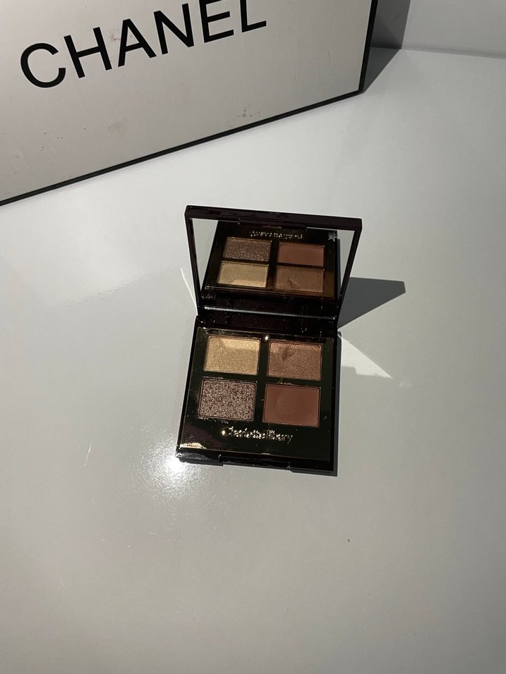 Chanel göz farı paleti, mat ve ışıltılı karışık dört koyu bej renkten oluşur. Kompakt tasarımda uygulama için ayna bulunur.