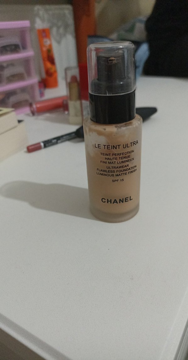 Chanel Le Teint Ultra fondöten, açık bej tonunda, kusursuz ve ışıl ışıl bir görünüm sağlar, uzun süre kalıcı ve SPF 15 korumalıdır. yarısı dolu. temiz kullanılmıştır