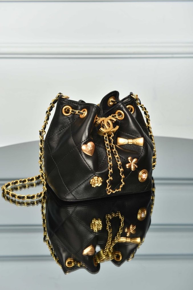 Kadın derisi çanta, parlak altın zincir detayları ve desenli süslemeleriyle cesur gotik ve Paris tarzını birleştiriyor. Günlük kullanıma uygun. CHANEL - Mini Bucket Bag İthal Ürün Ölçüler: 16 × 12.5 × 16 cm