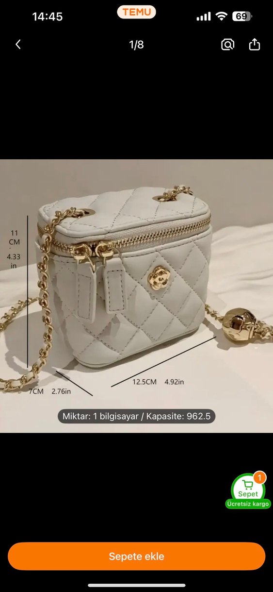 Beyaz deri, kareli desenli ve altın zincir detaylı çanta. Yaklaşık 11x12.5x7 cm ölçülerinde, modern klasik ve Paris tarzını yansıtır. Günlük kullanım için uygun. İthaldir