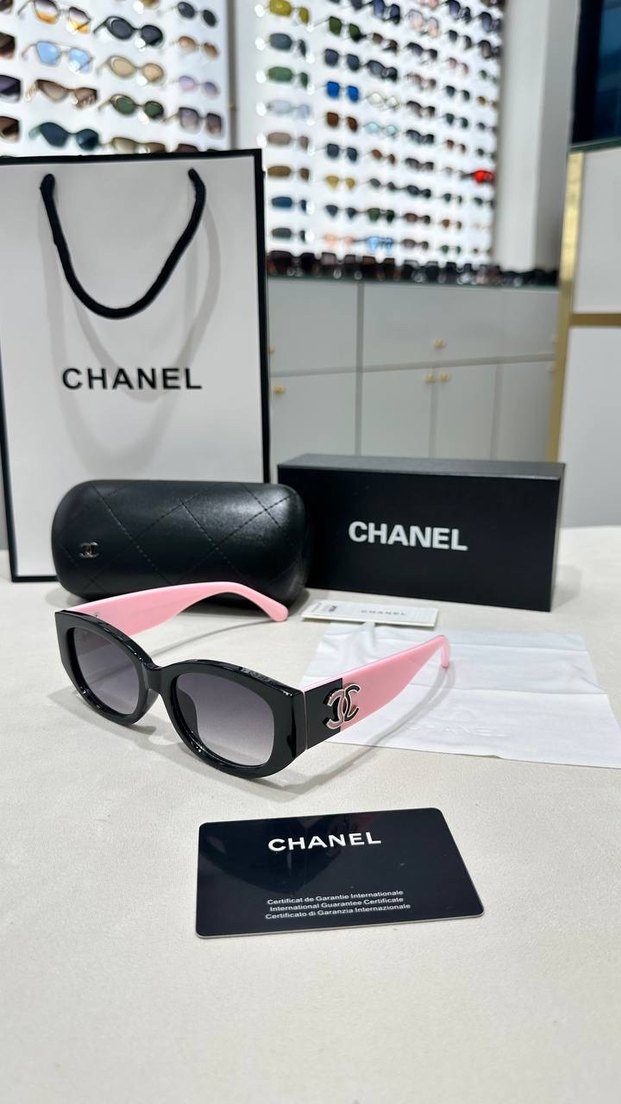 Chanel marka, parlak pembe pastel renkli saplı ve siyah çerçeveli kadın güneş gözlüğü. Şehirli ve trend sokak stili. Orijinal kutu ve sertifika dahil.