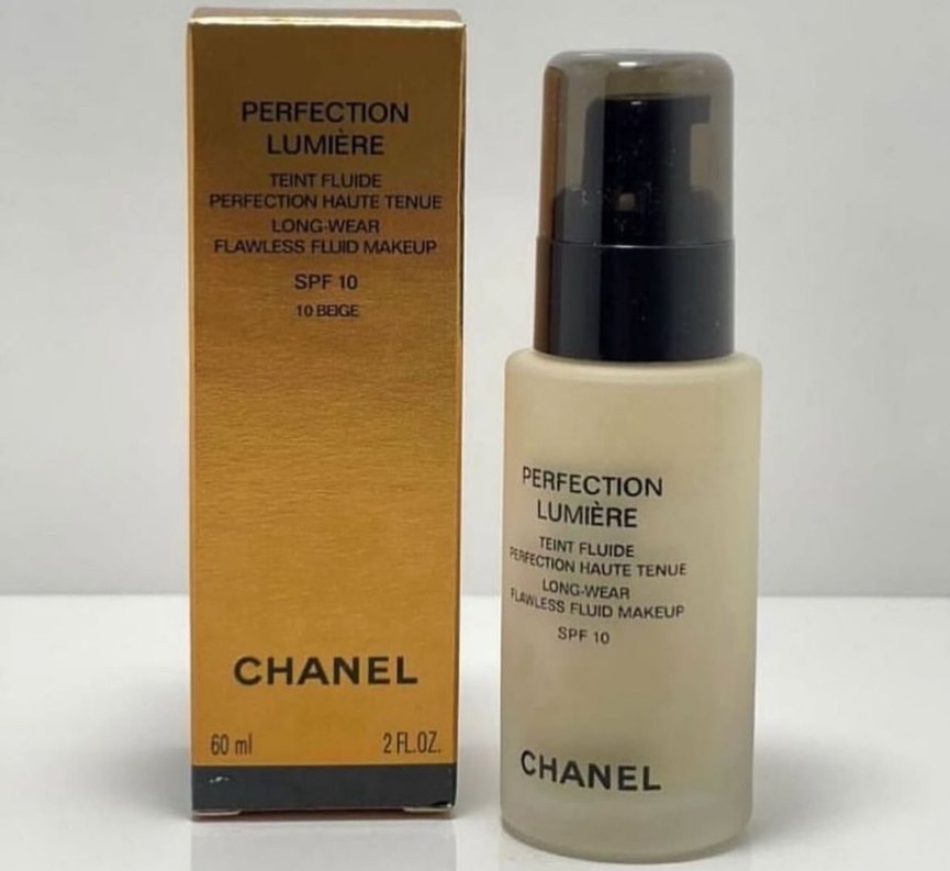 Chanel Perfection Lumière, SPF 10 korumalı, uzun süre kalıcı sıvı fondötendir. 60ml şişede pürüzsüz bej renk sağlar. ✨