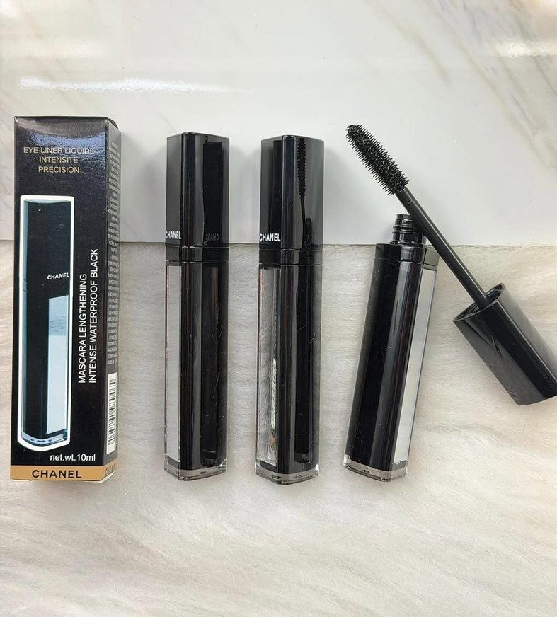 Chanel siyah suya dayanıklı maskara, yoğun ve koyu kirpikler için hacim veren fırça ile 10ml tüpte sunulur.