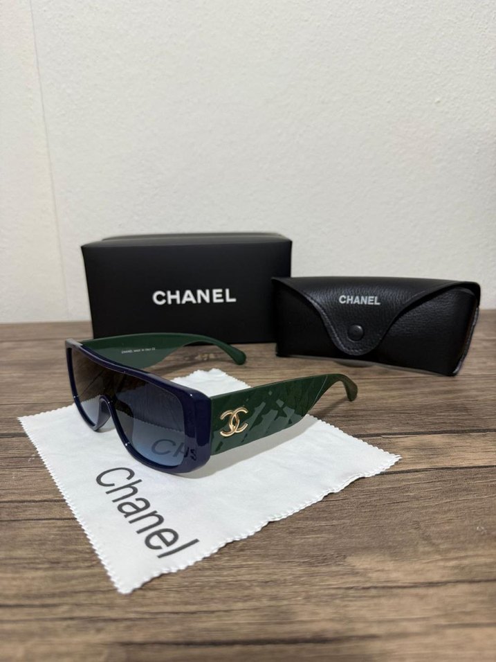 Chanel marka, parlak koyu yeşil çerçeveli klasik sokak tarzı kadın güneş gözlüğü. Kılıf ve temizleme bezi ile birlikte.