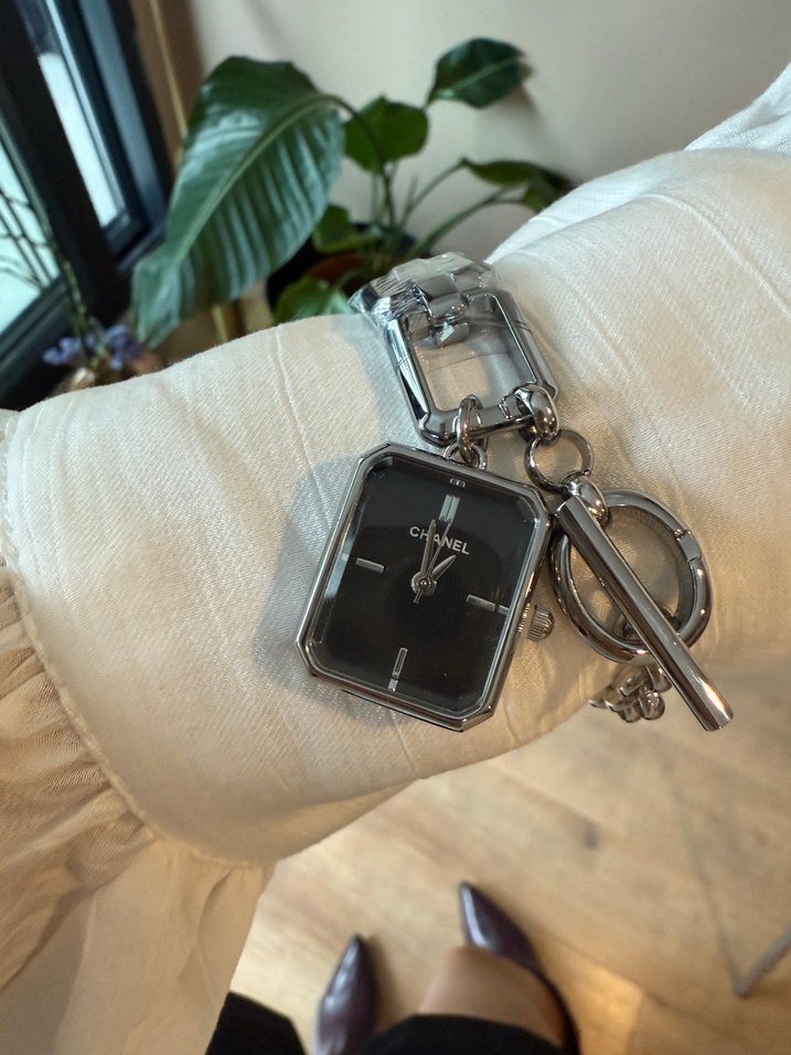 Zincir detaylı gümüş renk kayışı ve siyah kare kadranı ile çağdaş Paris tarzı kadın saati. ⌚