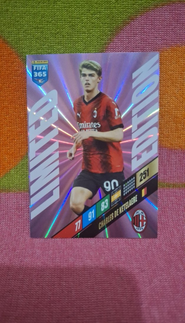 Charles De Ketelaere'in AC Milan formasıyla renkli futbol kartı, istatistikler ve holografik detaylar içerir. Pop kültür koleksiyonu için ideal. ⚽