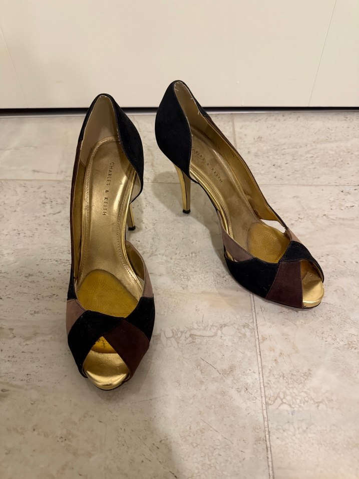 Charles & Keith marka, kahverengi süet malzemeden yapılmış, burnu açık stiletto topuklu kadın ayakkabıları. Ofis veya özel davetler için uygun klasik zarafet taşır. Topuğunda giyimden kaynaklı bir iki ezilme mevcut. Ayaktabanına daha rahat yürüyüş olsun diye yapışkanlı pedlerden koydum.