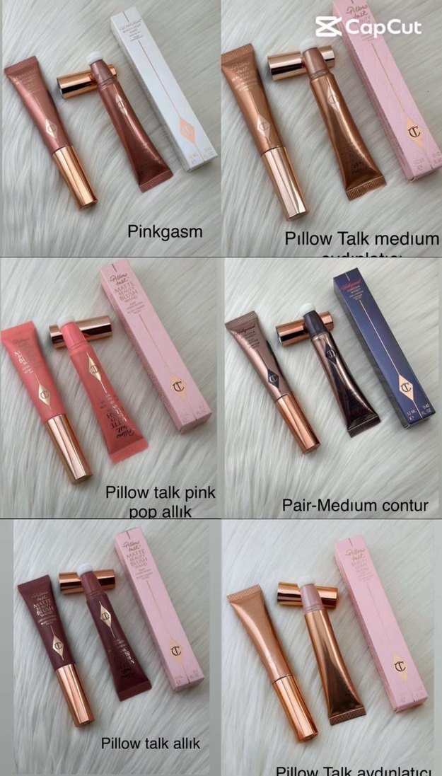Charlotte Tilbury kapatıcı ve aydınlatıcı seti, Pinkgasm, Pillow Talk Pink, Pillow Talk Medium ve Pair-Medium kontur gibi bej tonlarında renkler içerir.