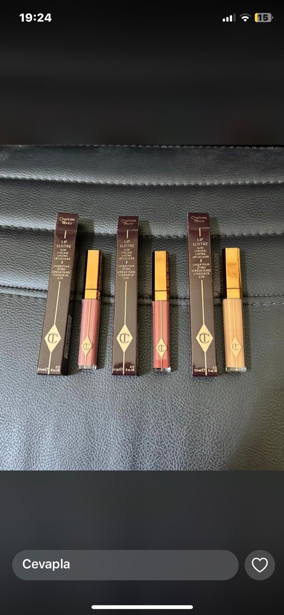 Charlotte Tilbury marka, koyu bej tonlarda dudak parlatıcısı seti. Parlak bitiş ve zengin renk sunar. Her biri altın kapaklı şık tüpte.