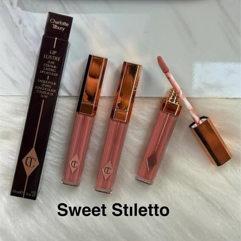 Charlotte Tilbury'nin Sweet Stiletto tonunda parlak pembe dudak parlatıcısı, canlı ve parlak bir görünüm sağlar.