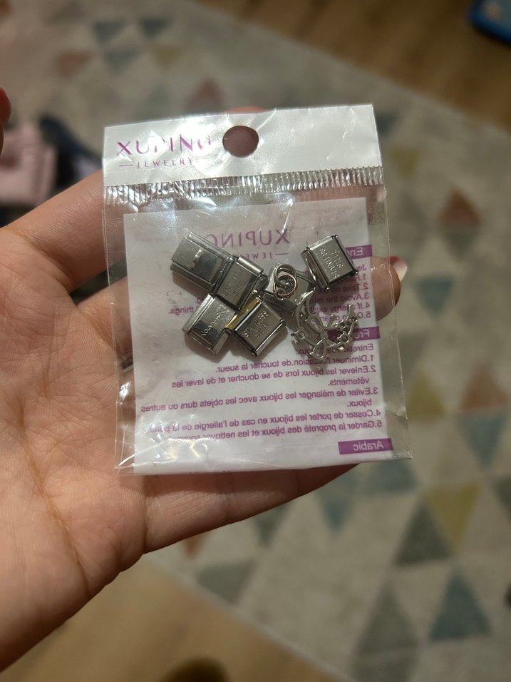 Gri ve altın renkli payetli, minimal desenli kadın charm. Günlük kullanıma uygun, modaya uygun bir aksesuar. Birisi ay şeklinde taşlı diğerleri düz
