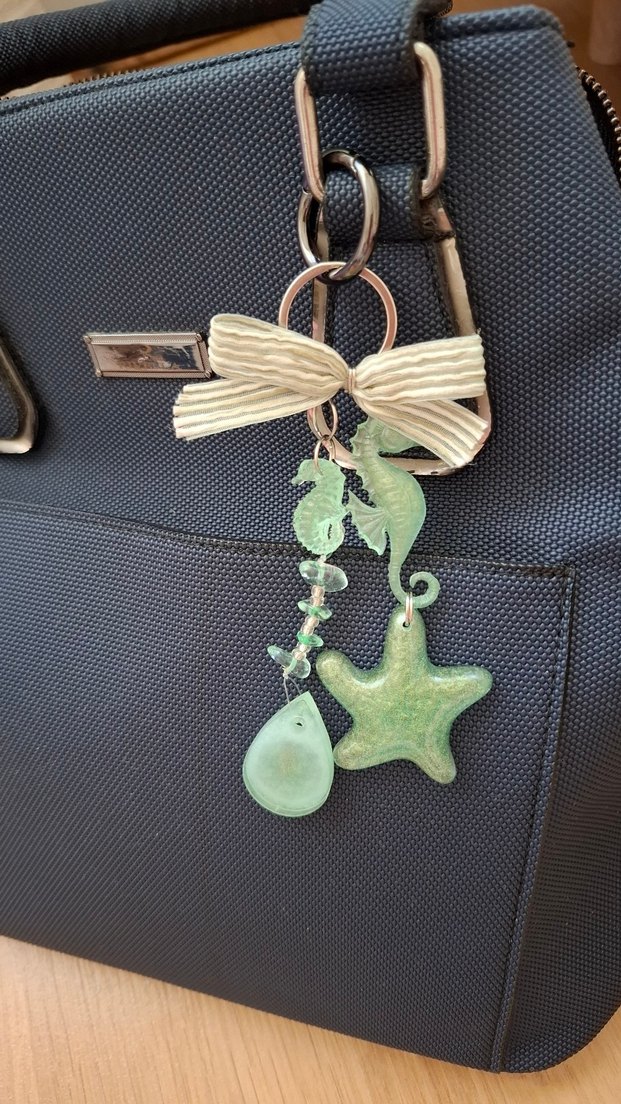 Bohem tarzda, pastel su yeşili renkli deniz temalı figürler ve krem fiyonk ile süslenmiş taş detaylı anahtarlık.