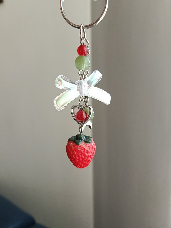 Bohem tarzda, renkli boncuklar ve kırmızı çilek figürü ile şeffaf fiyonk ve küçük kalp detaylı anahtarlık.