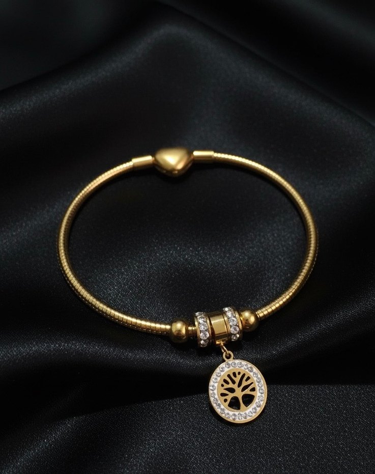 Altın renkli, zincir detaylı bileklik. Küçük taşlarla süslenmiş ağaç figürlü kolye ucu bulunur. Günlük kullanıma uygun, minimalist ve bohem tarzda.