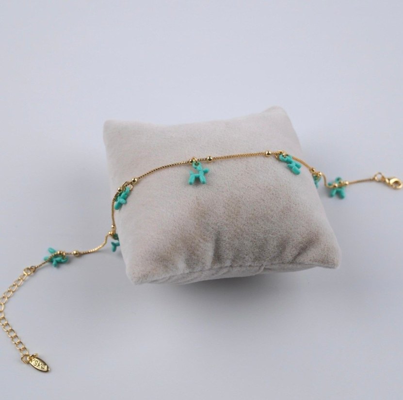 Turkuaz boncuklu küçük figürlerin yer aldığı ince altın zincirli bohem tarz halhal, günlük kullanıma uygun.