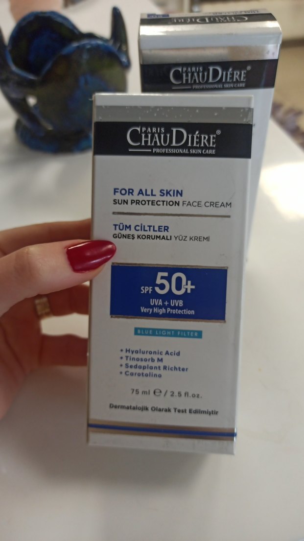 Chaudier güneş koruyucu yüz kremi SPF 50+ ile UVA ve UVB filtreleri içerir. Hyalüronik asit, Tinosorb M ve Sedoplant Richter ile çok yüksek koruma sağlar. Tüm cilt tipleri için uygundur. ☀️
