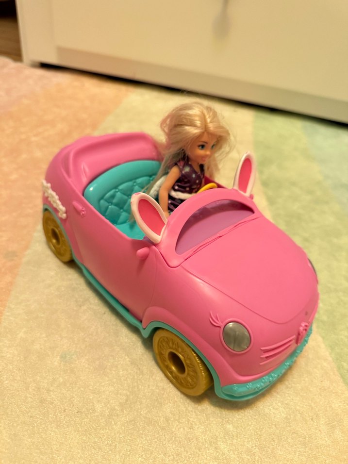 Pastel pembe renkte, tavşan kulaklı oyuncak araba. İç kısmı turkuaz, tekerlekleri sarı renkte ve içinde küçük bir bebek oturuyor.