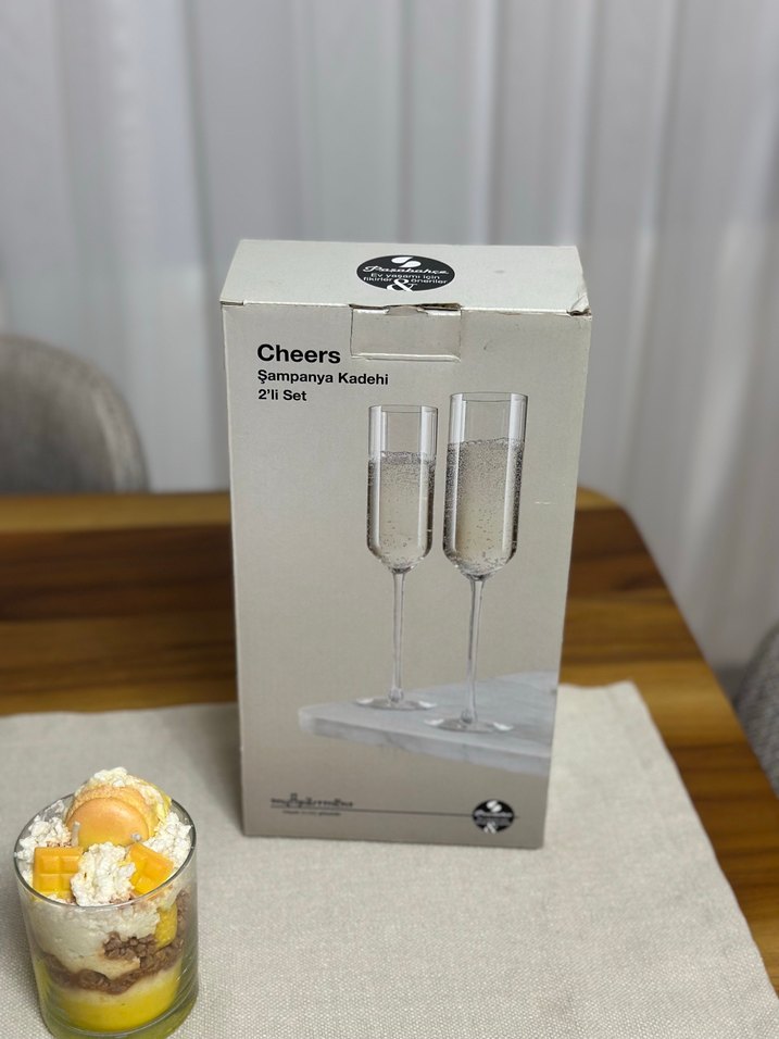 İki adet şeffaf şampanya kadehi seti, köpüklü içecekler için uygundur. Kutuda Cheers markası yer almaktadır.