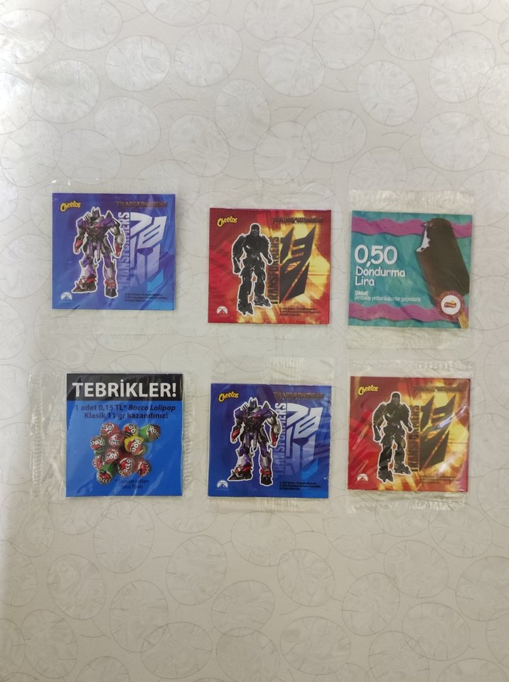 Robot ve karakter tasarımlı, çeşitli renklerde küçük oyuncak paketleri seti. Üzerinde 'TEBRİKLER!' yazılı 0,50 dondurma liralı lolipop içerir. DİKKAT NOT:SADECE HEPSİ BİRLİKTE SATILIK OLUP FİYAT TEMSİLİDİR ALICININ MANTIKLI TEKLİFİNE HEPSİNİ GÖNDERECEĞİM, 6 ADET ORJİNAL CİPSTEN ÇIKAN PAKETLİ SIFIR FRİTOLAY KARTLARI,