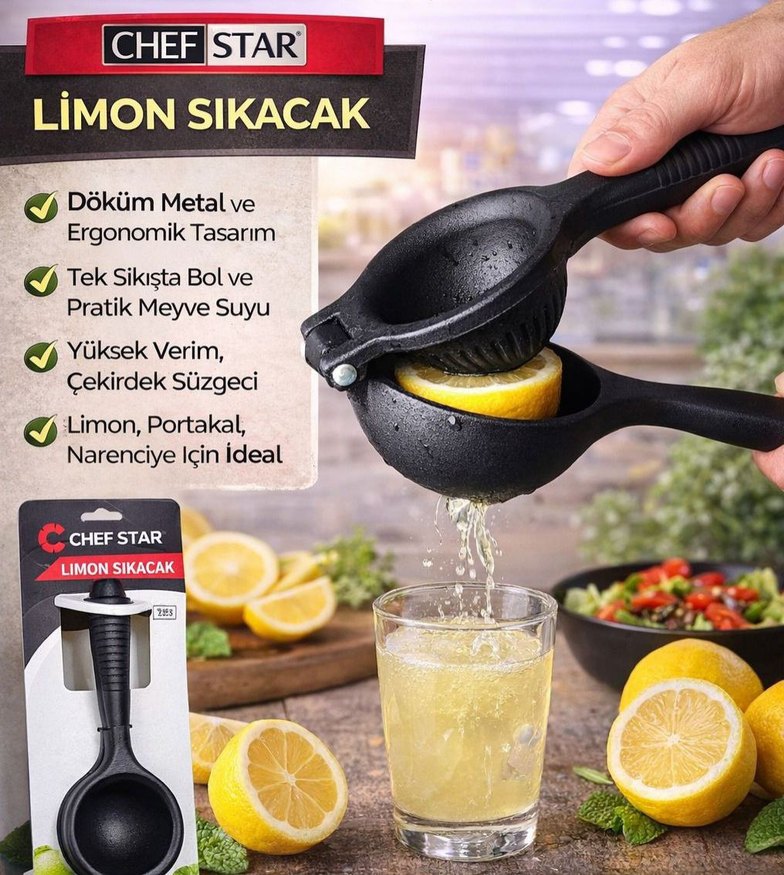 Chefstar siyah döküm metal limon sıkacağı, ergonomik tasarımıyla kolay ve verimli meyve suyu çıkarır. Çekirdek süzgeci bulunur, limon ve portakal için uygundur.