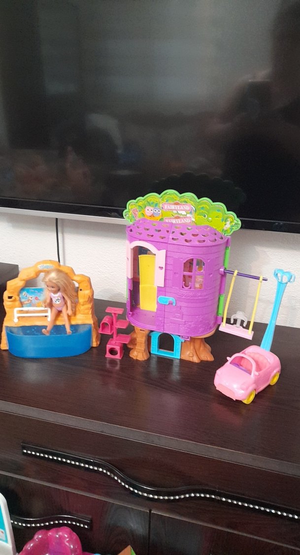 Pembe ağaç ev, salıncak, küçük araba ve aksesuarlarıyla renkli oyuncak seti. Canlı ve eğlenceli tasarım. ürün orjinaldir fakat ağaç evin yarım bir kapısı yoktur salincaginin aşkı aparatı kayıptır ben görsel amaçlı pipetle tutturdum inceleyerek alım yapiniz