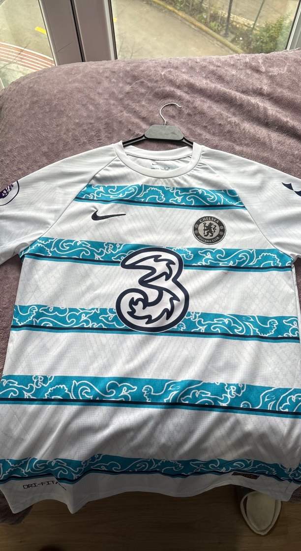 Beyaz, baskılı mavi desenlere sahip, yuvarlak yakalı ve kısa kollu erkek tişörtü. Düğmeli detaylı, bol kesim ve günlük kullanıma uygun. ⚽ ufak bir cikolata lekesi vardır yıkayınca gecer