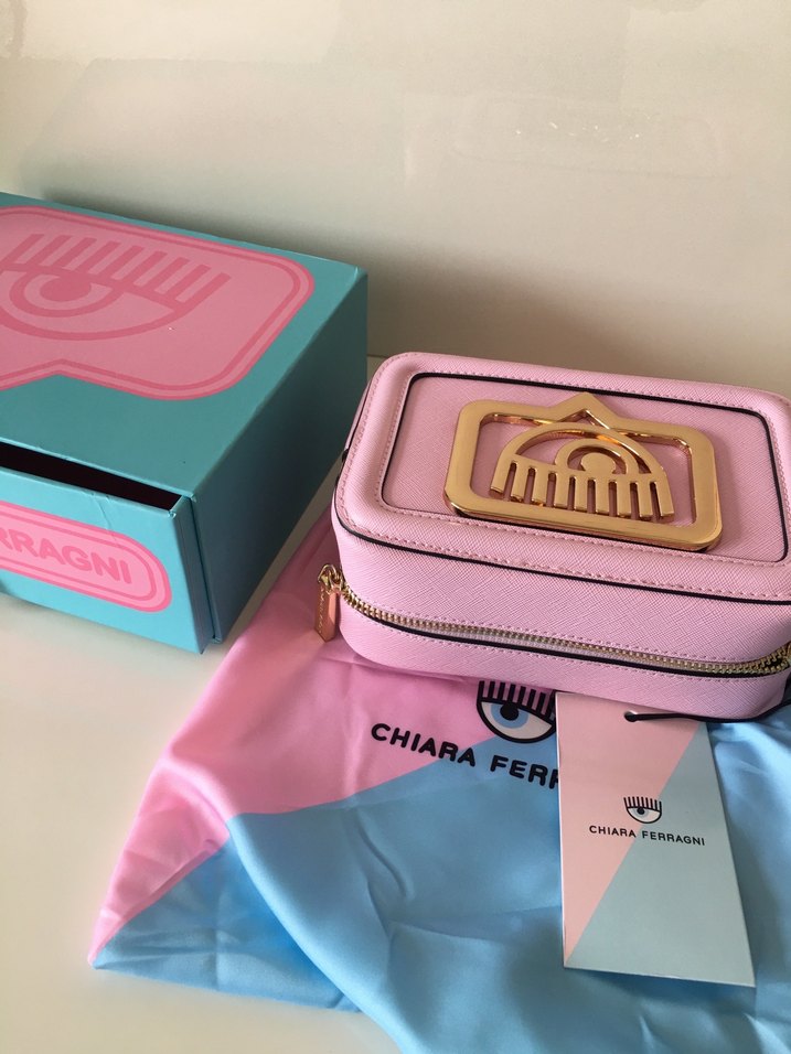 Pastel pembe renkli, fermuarlı ve baskılı tasarıma sahip plastik kadın çapraz çanta. Paris sokak modasını yansıtır, Chiara Ferragni markalıdır.