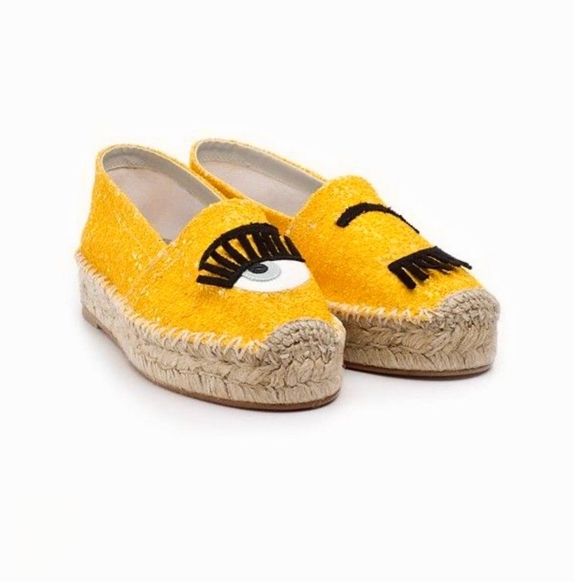 Sarı renkli, Chiara Ferragni göz desenleri ve fırfır detaylı espadril, size 36