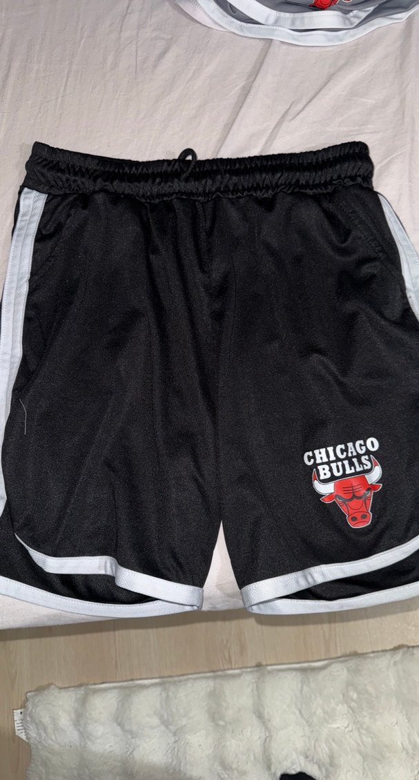 Chicago Bulls baskılı, kemerli, sentetik kumaş siyah erkek spor şortu. Athleisure ve streetwear tarzına uygun.