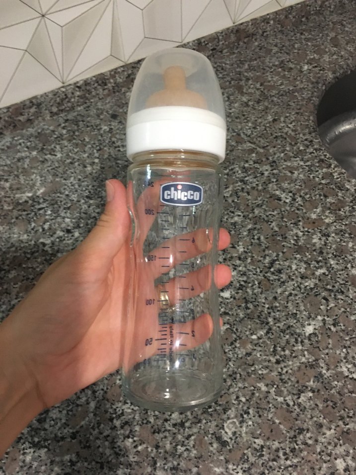 Chicco bebek biberonu, ölçü işaretleri ile şeffaf, beyaz-gri tasarımlı. Kolay besleme ve temizlik sağlar.