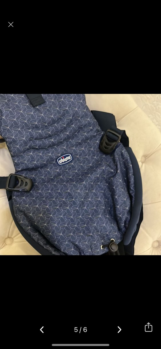 Chicco bebek taşıyıcı, mavi ve gri desenli kumaş ile güvenli tokalar içerir. Hem bebeğe hem ebeveyne konforlu destek sağlar.