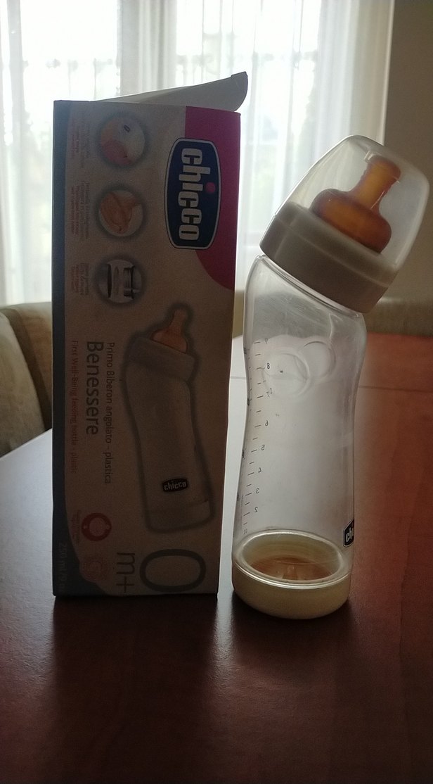 Chicco Benessere bebek biberonu beyaz yumuşak silikon emzikli, ölçü işaretli ve koruyucu kapaklıdır.