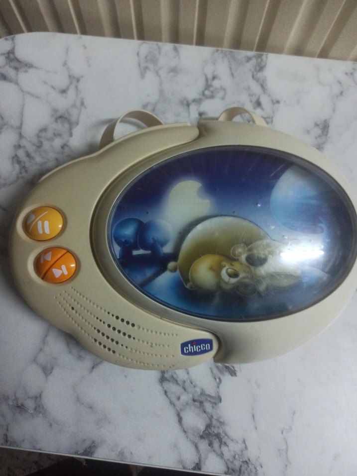 Chicco markalı beyaz müzikli oyuncak, hafif renkler ve kolay kullanımlı düğmelerle rahatlatıcı sesler ve görseller sunar.