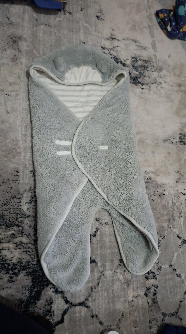 Kapüşonlu ve ayaklı, gri nakışlı yumuşak bebek battaniyesi kundak , bebekleri sıcak tutmak için tasarlanmıştır.