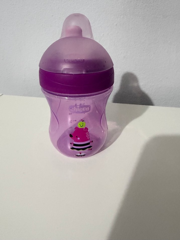 Mor renkli, renkli desenli ve koruyucu kapaklı bebek alıştırma bardağı suluğu.