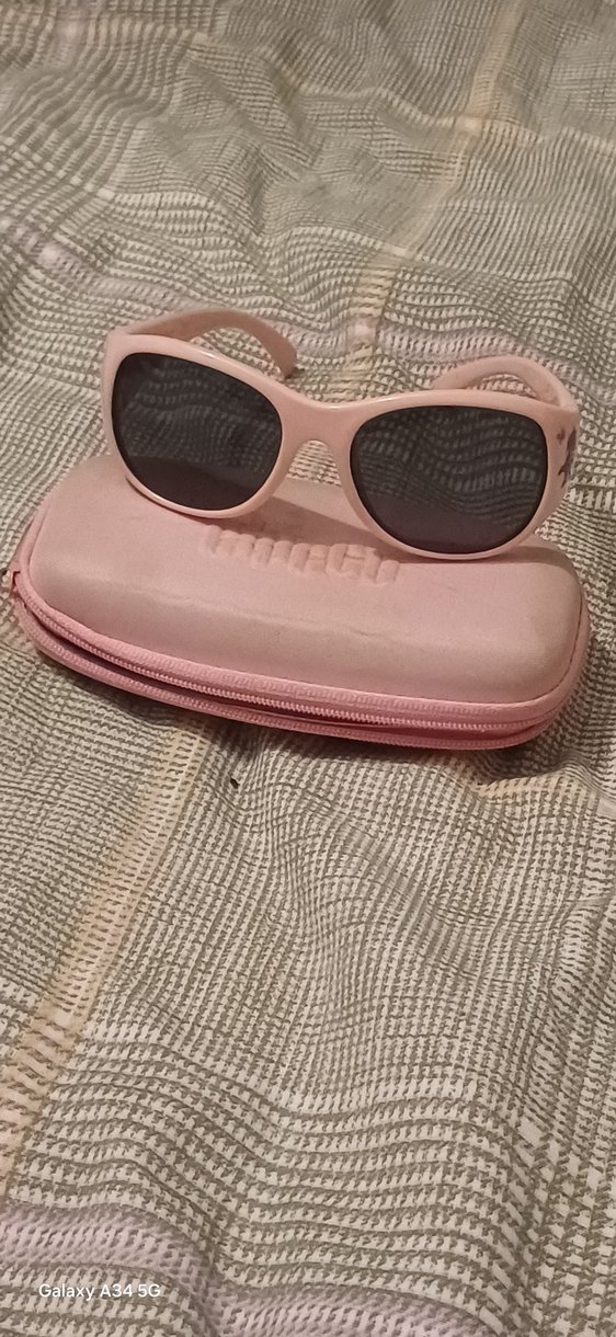 Pastel pembe kız güneş gözlüğü ,eğilip bükülse de kırılmaz özellikte.Kılıfını kızım kalemlerle çizmiş