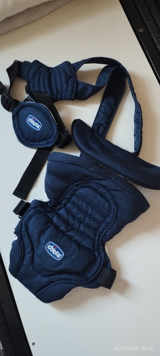 Chicco marka koyu mavi bebek taşıyıcı, dolgulu askılar ve ergonomik tasarıma sahiptir. Bebek ve küçük çocuklar için uygundur.