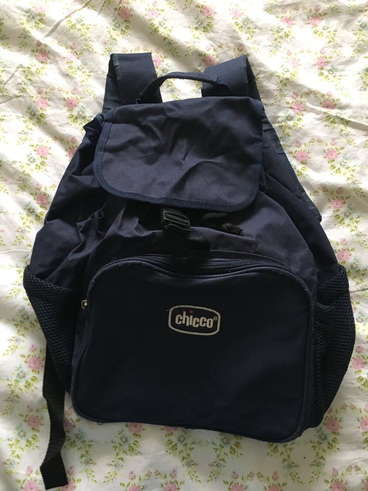 Koyu lacivert renkli, fermuarlı bölmelere sahip, günlük kullanıma uygun, minimalist sokak tarzı kadın sırt çantası. Ön cepte Chicco logosu bulunur. Büzme kumaşı sokuldu kullanıma engel değildir