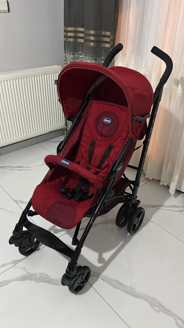 Koyu kırmızı renkte Chicco marka bebek arabası, tente, yastıklı oturma alanı ve güvenlik kemeriyle konforlu ve güvenli kullanım sağlar. Hafif çerçeveli ve dört tekerlekli yapıya sahiptir.