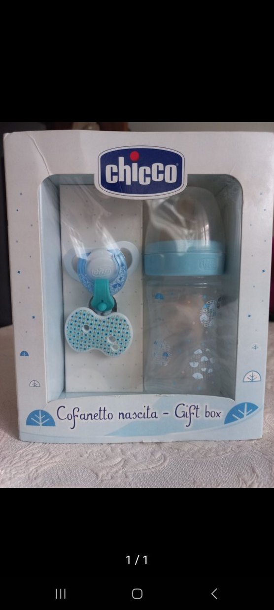 Chicco marka pastel mavi bebek biberonu ve emzik klipsi içeren hediye kutusu. Bebek besleme ve rahatlatma için uygundur.