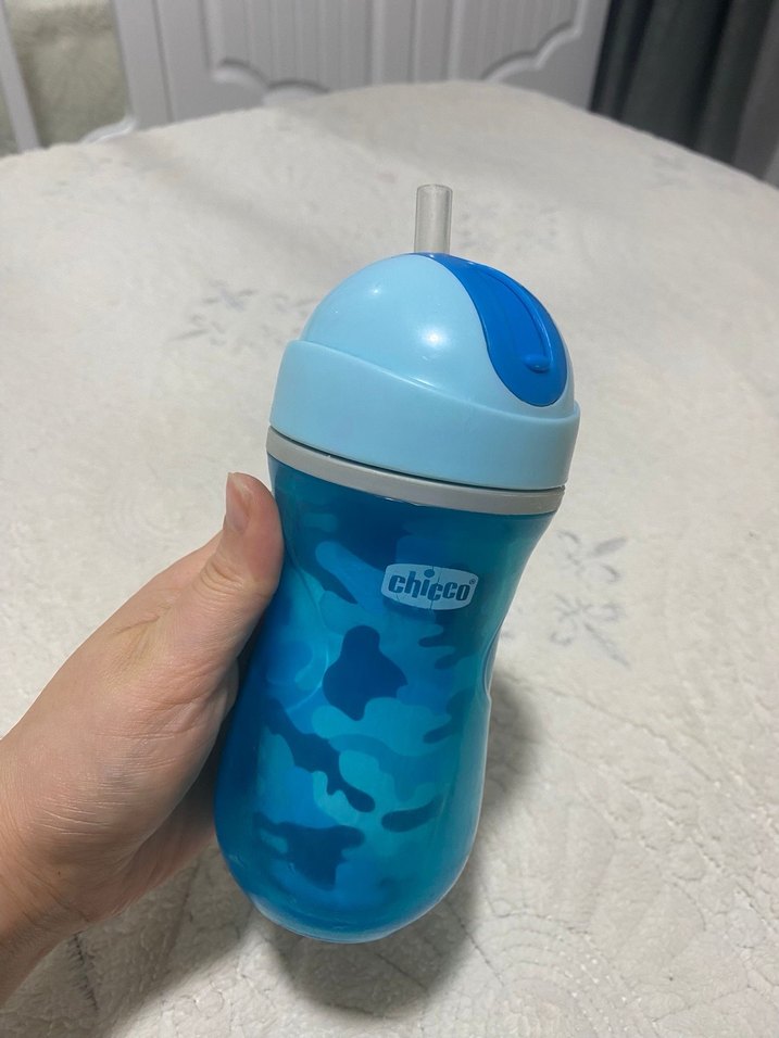 Chicco markalı, renkli desenli ve kullanımı kolay pipetli mavi bebek biberonu.