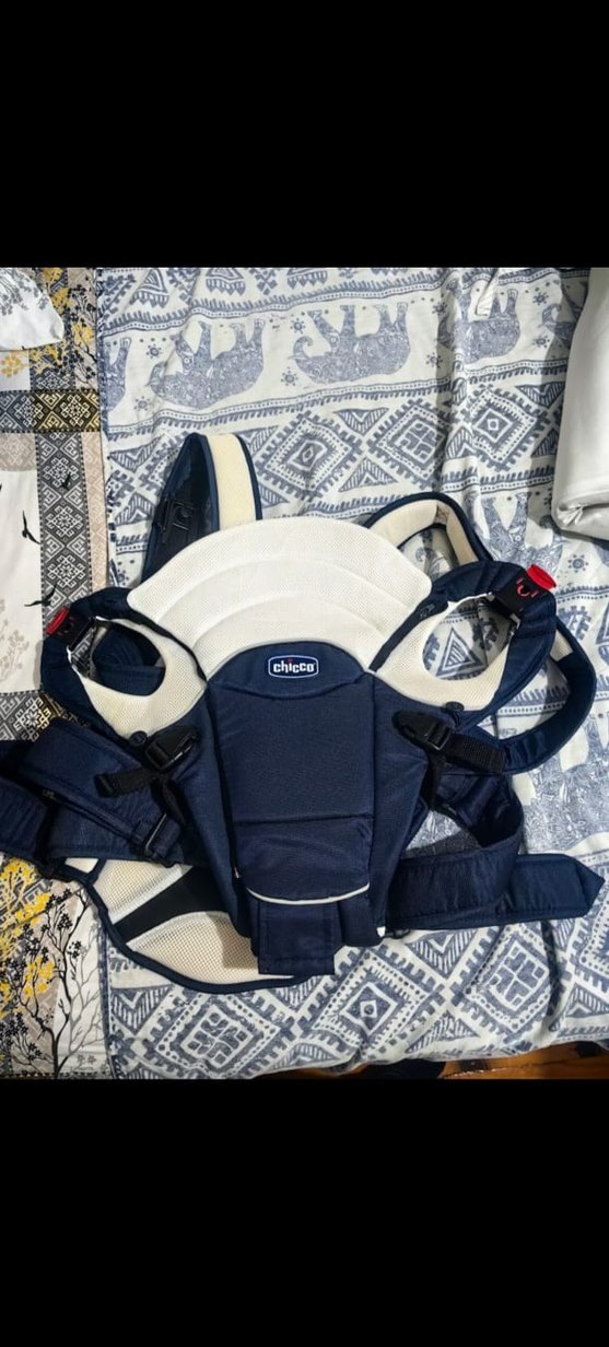 Chicco marka mavi bebek taşıyıcı, yumuşak dolgulu kayışlar ve güvenli tasarıma sahiptir. Rahat taşıma ve destek sağlar.