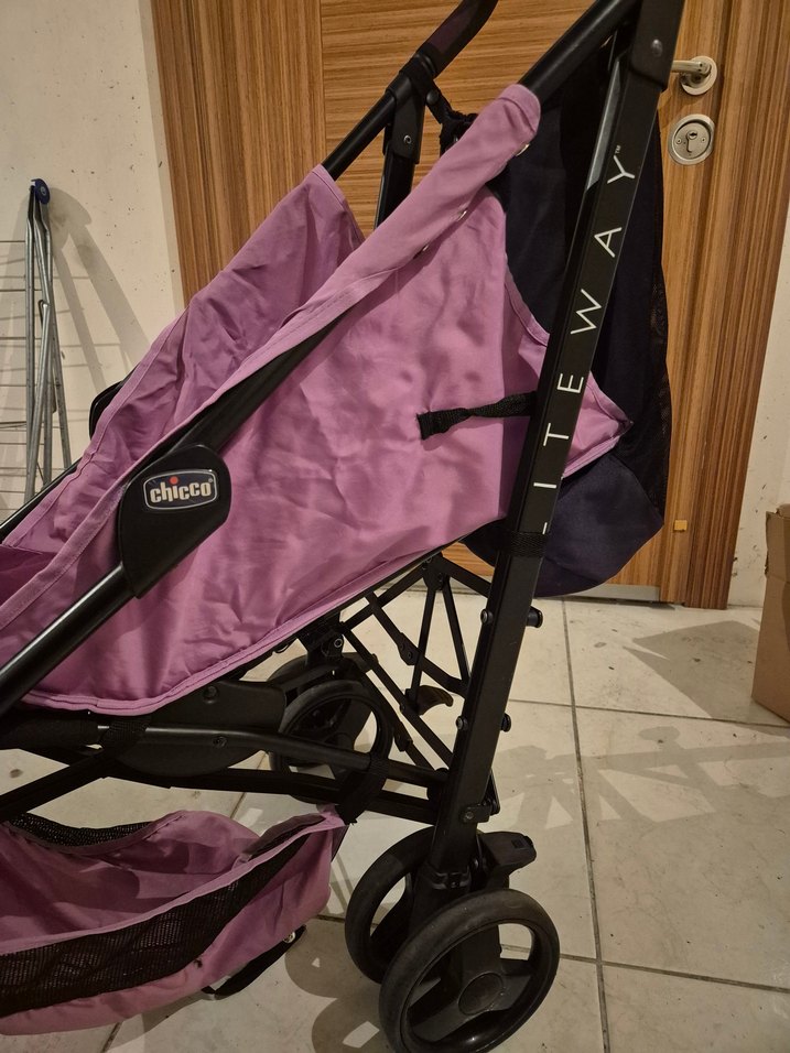Chicco marka koyu mor renkli, sağlam siyah iskeletli bebek arabası, konforlu ve kullanımı kolaydır.