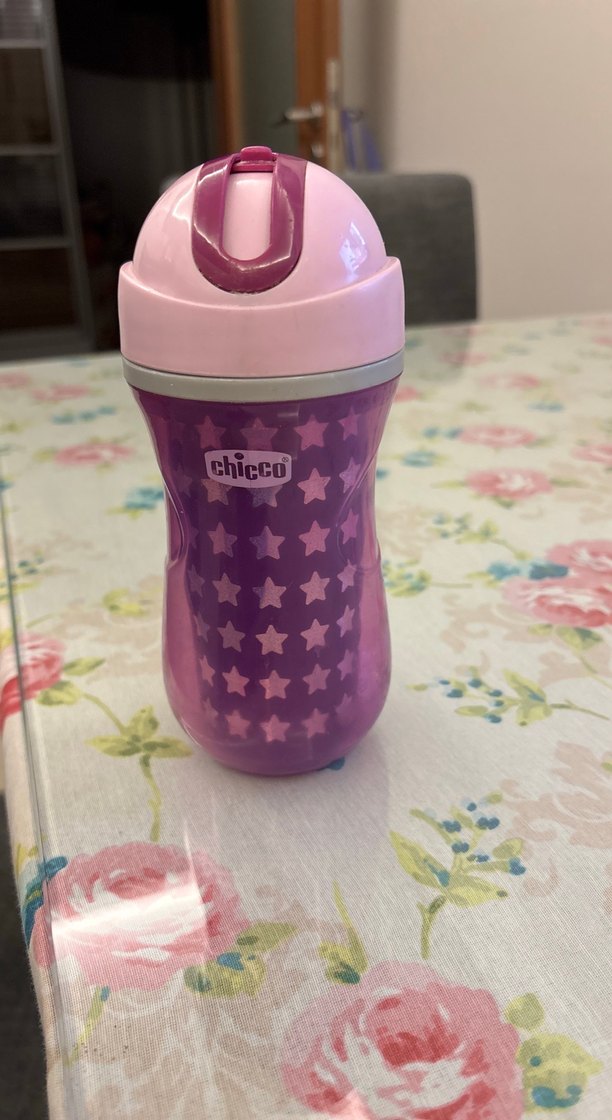 Chicco marka, mor renkli, renkli yıldız desenli, güvenli kapaklı bebek biberonu. Kolay kullanım sağlar.