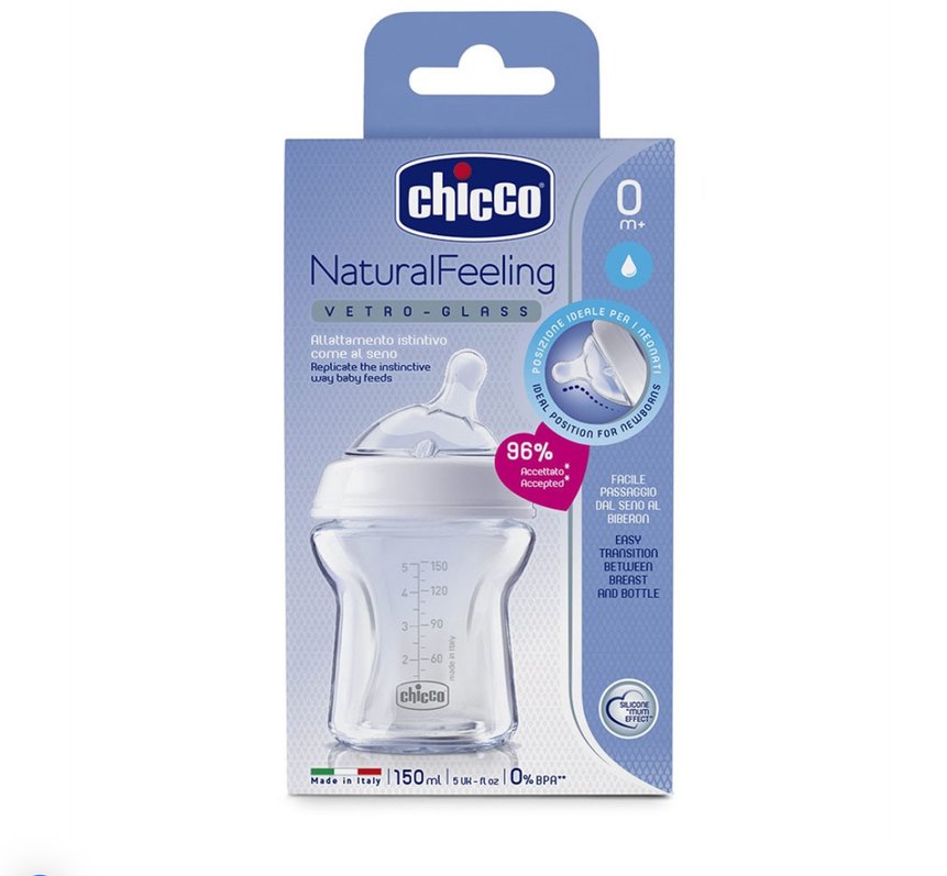 Chicco NaturalFeeling bebek biberonu, camdan üretilmiş ve emzirme hissini taklit eden tasarıma sahip. %96 kabul oranı, kolay geçiş sağlayan emzik ve BPA içermez. 0+ ay için uygundur. 0 Üründür