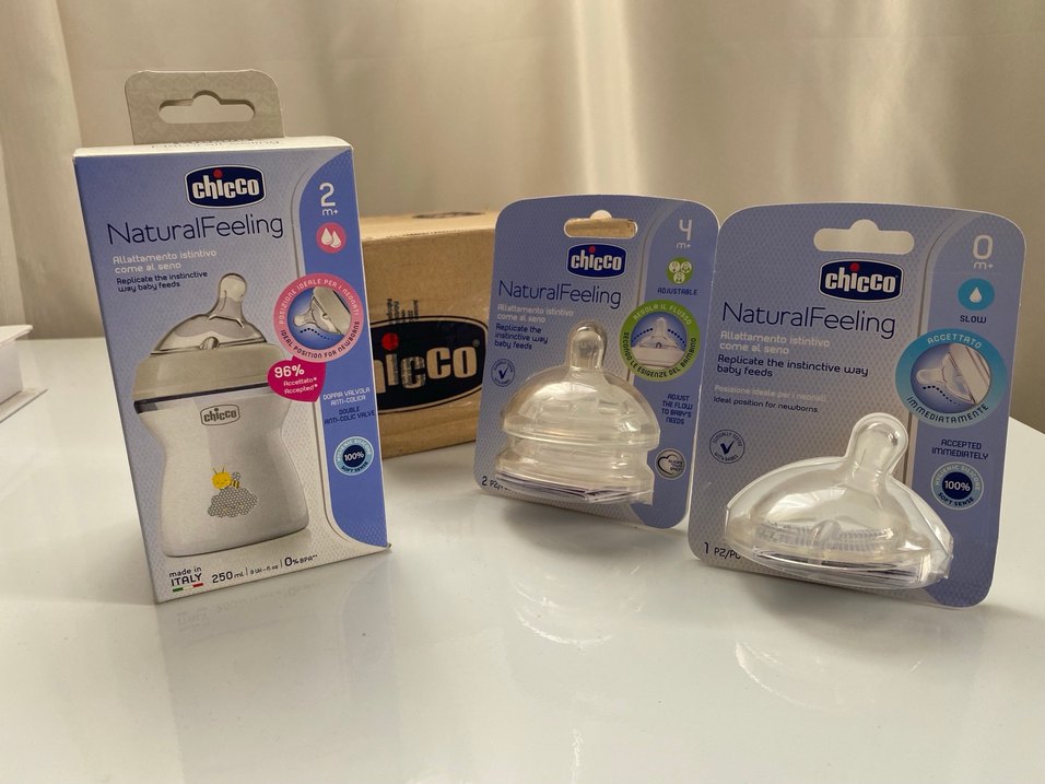 Chicco NaturalFeeling 250 ml biberon. Biberonda 2 ay akışlı başlık var bir kez denendi sterilize edip kaldırıldı. 1 adet 0 ay akışlı başlık ve 2 adet 4 ay akışlı başlık hiç kullanılmadı kapalı paket.