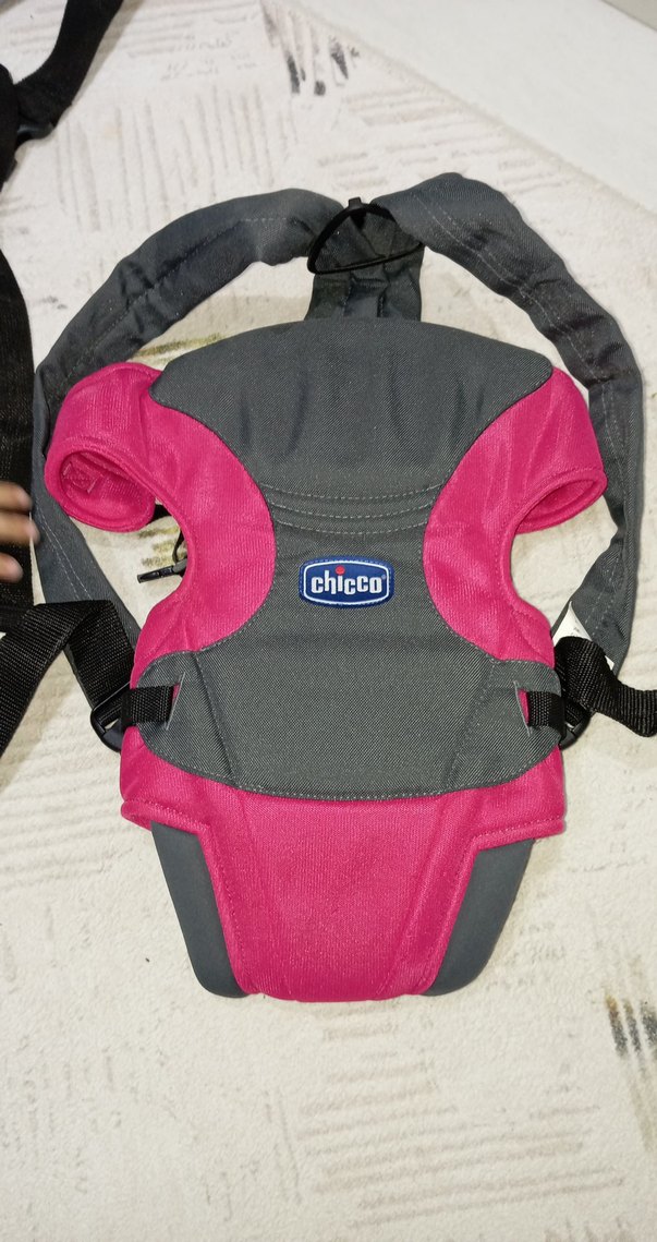 Chicco marka, pembe ve gri renklerde, ayarlanabilir askılı ve destekli rahat bebek taşıyıcı.