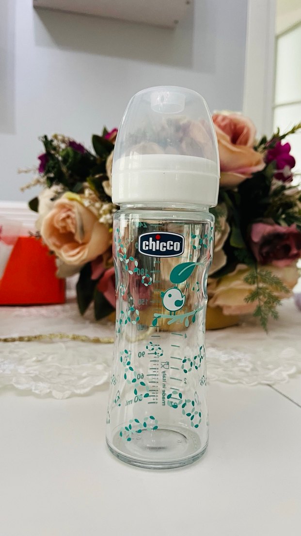 Chicco marka, renkli desenlere sahip beyaz kapaklı bebek biberonu. Ölçü işaretleri ile kullanım kolaylığı sağlar.