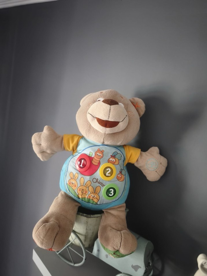 Önünde 1, 2 ve 3 numaralı düğmeler bulunan renkli eğitici oyuncak ayıcık. Yumuşak kumaş ve eğlenceli hayvan desenlerine sahiptir.